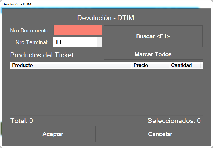 Ingresar número de documento, de lo contrario presionar <f1> se busca documento y nro de terminal.